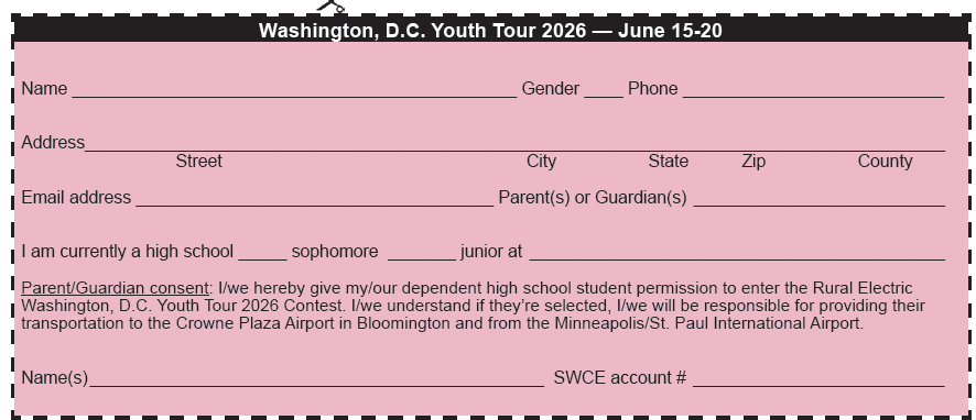 3. Videos may be emailed to Member Services Supervisor Randy Sobrack at rsobrack@swce.coop. Applicants may either mail, email, or drop off the application form and letters of recommendation to: Steele-Waseca Cooperative Electric, c/o Youth Tour 2026, PO Box 485, Owatonna, MN 55060. Entries must be received in Steele-Waseca’s office on or before Wednesday, Feb. 11, 2026. The two Youth Tour recipients will be notified by Wednesday, March 11, 2026. All entrants completing the application requirements will be entered into a drawing for a $250 gift card that will be announced at Steele-Waseca’s annual meeting Tuesday, June 2, 2026.
